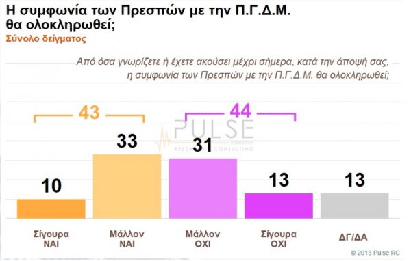 Οι πολίτες πάντως, εμφανίζονται απολύτως διχασμένοι στην εκτίμηση αν τελικά θα ολοκληρωθεί η Συμφωνία των Πρεσπών, αφού σε ποσοστό 43% δηλώνουν ότι θα ολοκληρωθεί και σε ποσοστό 44% ότι δεν θα ολοκληρωθεί. Οι υπόλοιποι δηλώνουν ότι δεν ξέρουν ή δεν απαντούν.