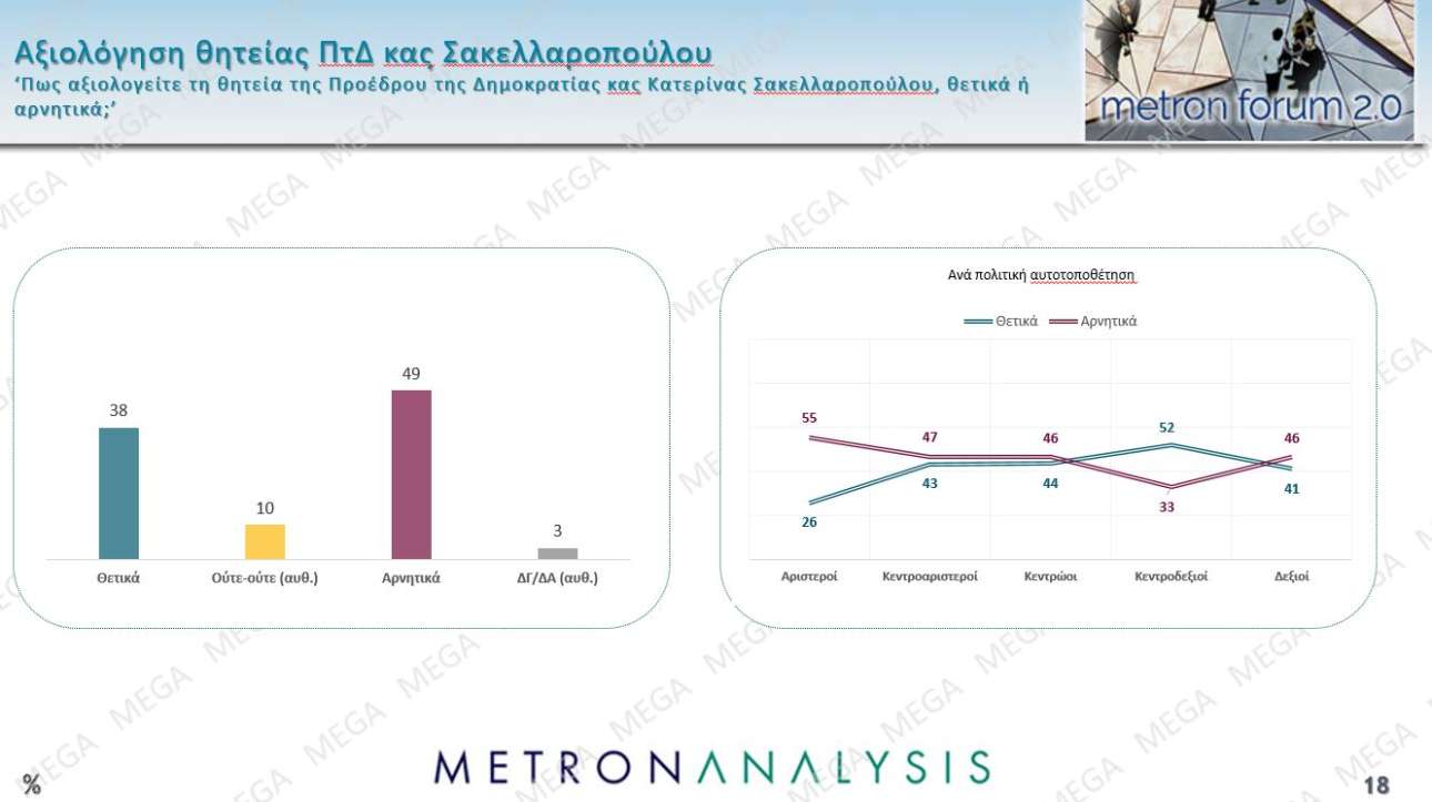 Η Metron Analysis ζήτησε από τους ερωτώμενους να διατυπώσουν τη γνώμη τους για τη θητεία της ΠτΔ Κατερίνας Σακελλαροπούλου. Εδώ οι αρνητικές γνώμες φαίνεται να υπερτερούν των θετικών. Εχει, όμως, ενδιαφέρον ότι την πιο θετική γνώμη έχουν όσοι αυτοπροσδιορίζονται ως κεντροδεξιοί, ενώ ακόμη και οι δεξιοί έχουν 41% θετική γνώμη.