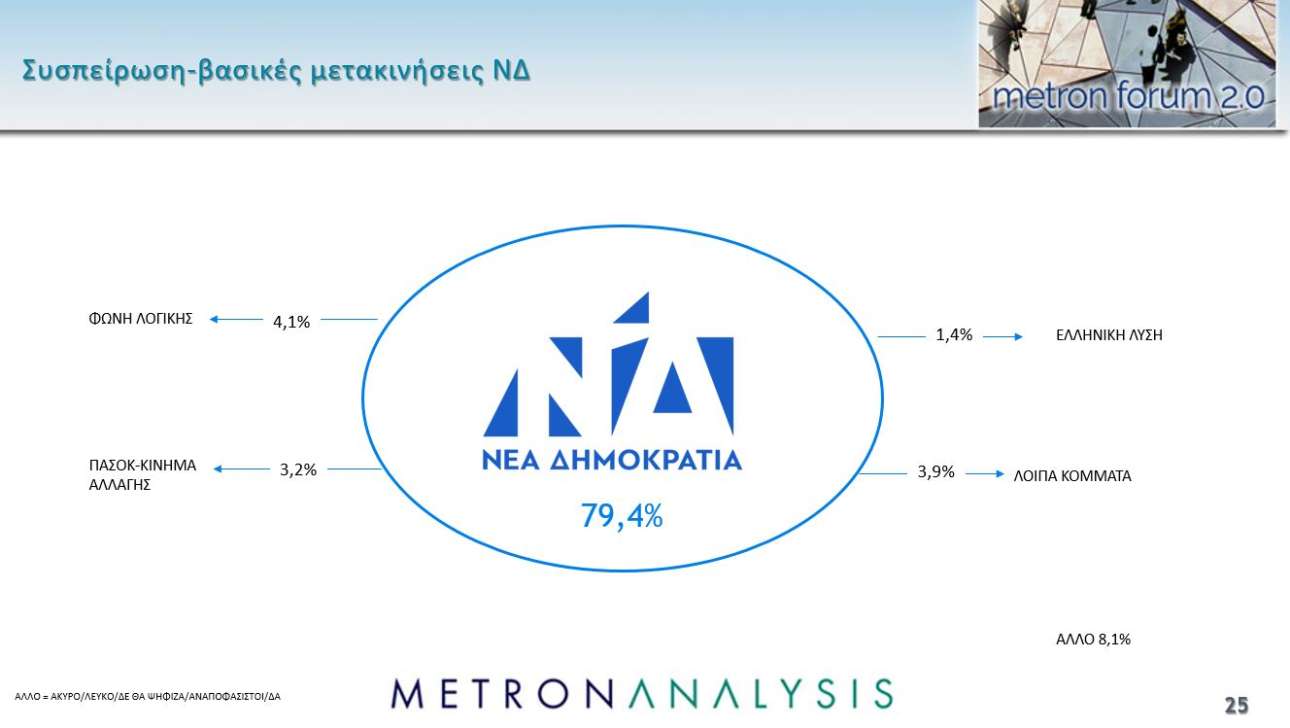 Ουσιαστικά τα ποσοστά της ΝΔ και του ΠΑΣΟΚ παραμένουν αμετάβλητα σε σχέση με την προηγούμενη μέτρηση της Metron Analysis.