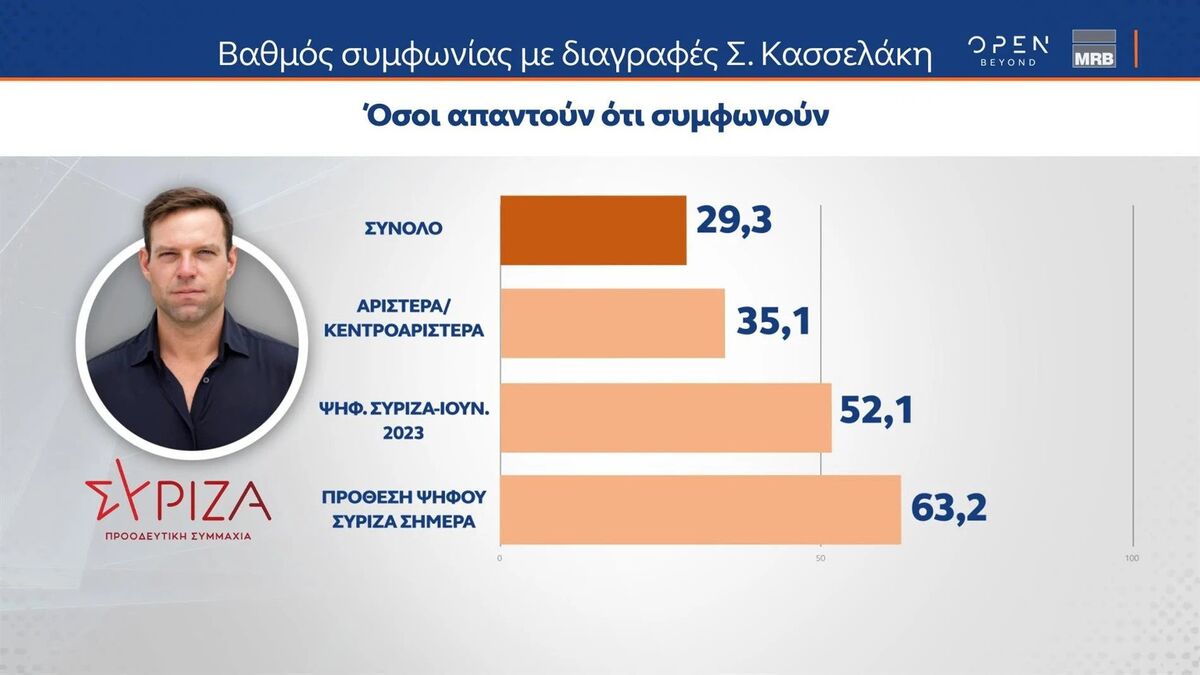 Επιπλέον, το 45,7% των ερωτηθέντων (γενικό σύνολο) διαφώνησε με τις διαγραφές που προανήγγειλε ο κ. Κασσελάκης, ενώ το 29,3% τις επικρότησε.