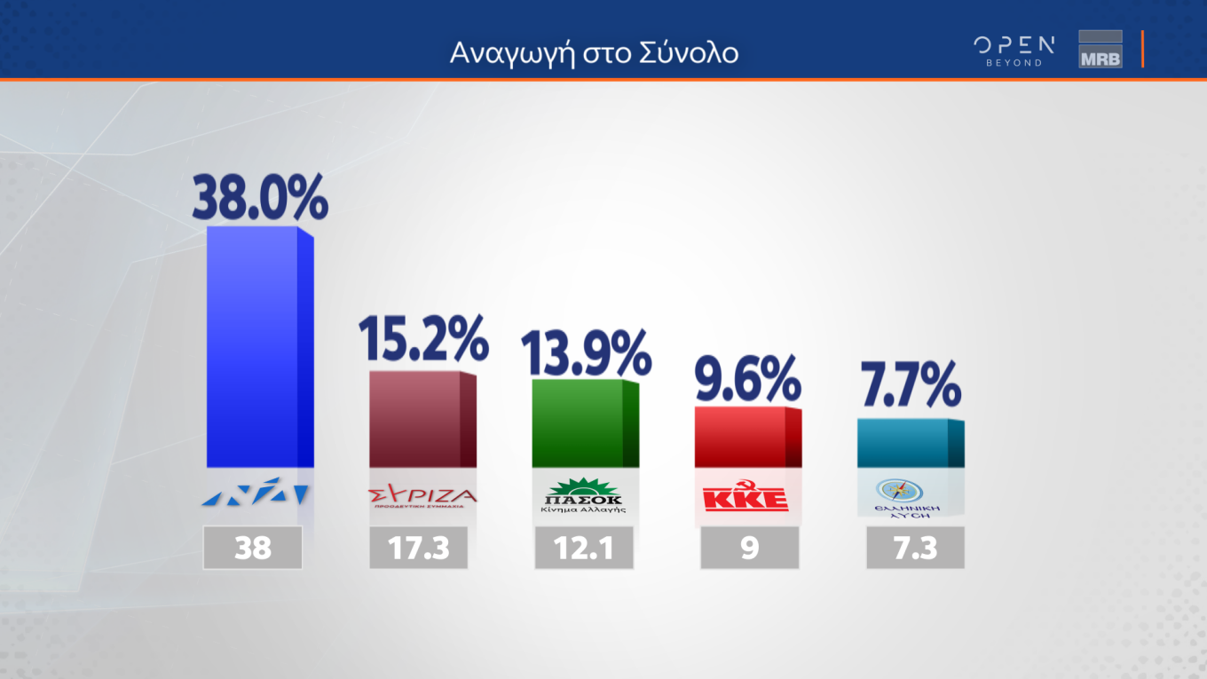 Ισχυρό προβάδισμα 20 και πλέον ποσοστιαίων μονάδων διατηρεί η Νέα Δημοκρατία έναντι του ΣΥΡΙΖΑ στην εκτίμηση ψήφου της δημοσκόπησης της MRB που παρουσιάστηκε από το OPEN, απηχώντας τα ευρήματα και των μετρήσεων που δόθηκαν στη δημοσιότητα τις προηγούμενες ημέρες. Την ίδια ώρα το κόμμα της αξιωματικής αντιπολίτευσης εμφανίζεται να δίνει μάχη με το ΠΑΣΟΚ-ΚΙΝΑΛ για τη δεύτερη θέση.