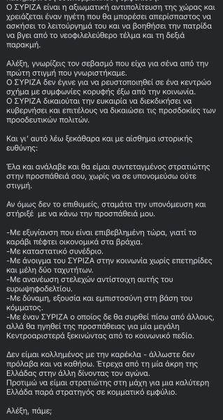 «Αλέξη έλα και ανάλαβε και θα είμαι συντεταγμένος στρατιώτης στην προσπάθειά σου, χωρίς να σε υπονομεύσω ούτε στιγμή. Αν όμως δεν το επιθυμείς, στήριξέ με να κάνω την προσπάθεια για το κόμμα μας, χωρίς παιχνίδια», έγραψε χαρακτηριστικά ο κ. Κασσελάκης στην ανάρτησή του από τις ΗΠΑ (σ.σ. επιστρέφει στην Ελλάδα τη Δευτέρα).