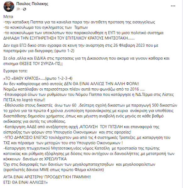 «Δεν είχα ΕΓΩ (σ.σ. δική του επιλογή η χρήση των κεφαλαίων) δίκιο όταν έγραφα σε ‘κείνη την ανάρτηση στις 26 Φλεβαρη 2023 που με παρέπεμψαν για διαγραφή; Σε όλα αλλά και ΕΙΔΙΚΑ στις προτάσεις για τη Δικαιοσύνη που ακόμα να γίνουν καθαρά και επίσημα ΘΕΣΕΙΣ ΤΟΥ ΣΥΡΙΖΑ-ΠΣ;».