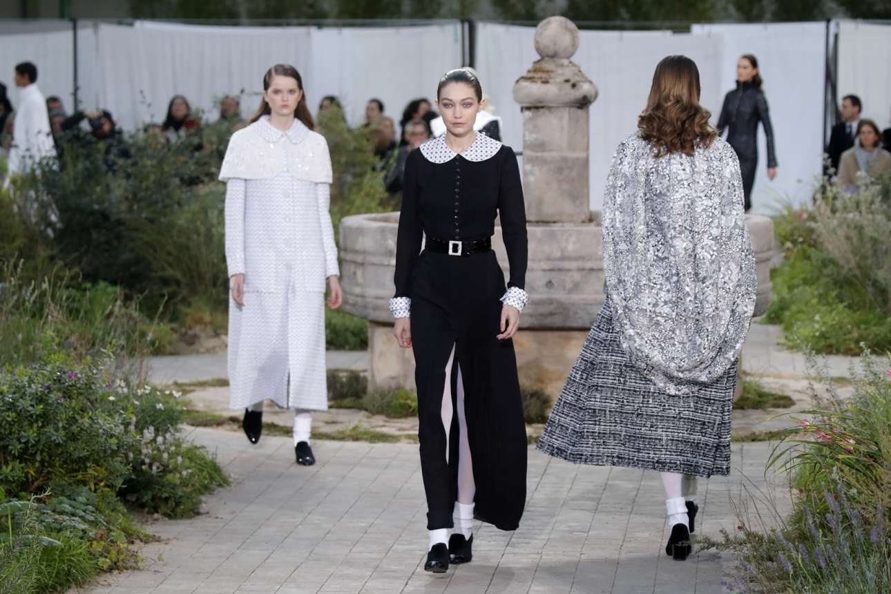 Οσο για τη Βιρζινί Βιάρντ του οίκου Chanel απλά συνέχισε το ύφος του μέντορα και προκατόχου της Καρλ Λάνγκερφελντ, αν και με τρόπο πιο μινιμαλιστικό. Σε ένα σκηνικό-αναφορά στον λαχανόκηπο του ορφανοτροφείου του καθολικού μοναστηριού Ομπαζίν, όπου μεγάλωσε η Κοκό Σανέλ (προφανώς) ανάμεσα σε καλόγριες και ντομάτες, με vintage ασπρόρουχα κρεμασμένα σε σκοινιά, η μαντάμ Βιάρντ παρουσίασε μια συλλογή σχεδόν αποκλειστικά ασπρόμαυρη, και σιλουέτες που εξελίσσονταν από μαθήτριες σε δασκάλες, απλοϊκές και ταυτόχρονα αυστηρές.