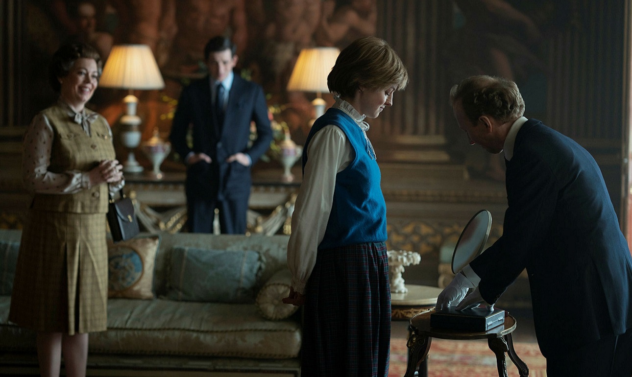 Κάποια στιγμή, τρομερά δυστυχισμένη, η Νταϊάνα προσπαθεί να αγκαλιάσει τη βασίλισσα. Και εκείνη στέκεται άκαμπτη, με τα χέρια της πεσμένα στο πλάι σαν πεθαμένος πιγκουίνος. Είναι μια αξέχαστη σκηνή, όπως και όταν η Νταϊάνα κάνει πατινάζ στους διαδρόμους του παλατιού, ακούγοντας τους Duran Duran στο Walkman της. Δεν βλέπουμε τον γάμο, μόνο ένα πλάνο της Νταϊάνα από πίσω με εκείνο το εκπληκτικό φόρεμα, σαν να ξεκινούσε να περπατάει αργά προς την αγχόνη.