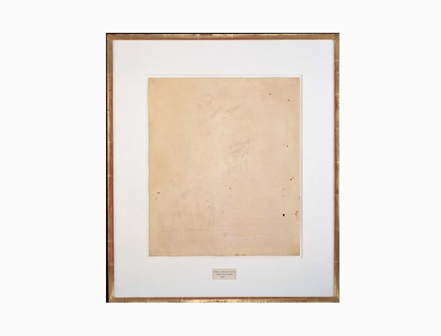 Το 1953, την ίδια χρονιά που οι επιμελητές στο V&A αποφάσισαν ότι τα σύγχρονα μάτια μπορούσαν, πλέον, να διαχειριστούν τα γεννητικά όργανα του «Δαβίδ», ο αμερικανός καλλιτέχνης Ρόμπερτ Ράουσενμπεργκ δοκίμασε τις δυνάμεις του στην τέχνη της απογύμνωσης των πραγμάτων. Περίεργος να μάθει αν θα μπορούσε να δημιουργήσει ένα έργο τέχνης αφαιρώντας σημάδια από μια επιφάνεια με γόμα, αντί να τα προσθέσει με μολύβι, πινέλο ή σμίλη, όπως κάνουν συμβατικά οι καλλιτέχνες, ο Ράουσενμπεργκ έπεισε τον φίλο του Βίλεμ ντε Κούνινγκ, ολλανδοαμερικανό εκπρόσωπο του αφηρημένου εξπρεσιονισμού, να θυσιάσει ένα πρόσφατο σχέδιό του για το πείραμα.