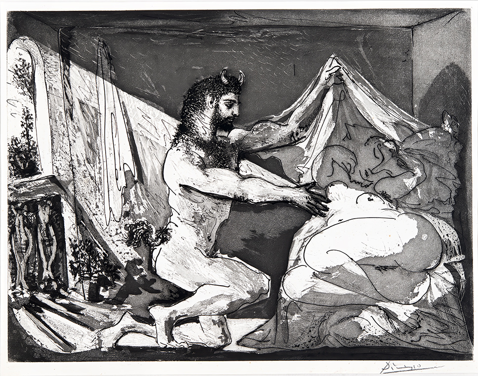 Στο χαρακτικό απεικονίζεται αριστερά ένας νεανικός ανθρωπόμορφος ημικαθιστός Φαύνος, κερασφόρος και γενειοφόρος με ουρά που εκφύεται από το πέρας της σπονδυλικής του στήλης. Με το αριστερό του χέρι ανασύρει το ύφασμα που κάλυπτε μια ξαπλωμένη γυναικεία κοιμώμενη μορφή. Είναι φανερή η σχέση του έργου με ανάλογα έργα της αρχαιότητας που ο Πικάσο είτε τα είχε δει σε διονυσιακές ρωμαϊκές σαρκοφάγους ή άλλες στο Μουσείο του Λούβρου ή σε άλλα μουσεία και αρχαιολογικούς χώρους ή ακόμα πιο πιθανόν είναι να τα είχε δει σε εκδόσεις της εποχής με αρχαιολογικό περιεχόμενο.