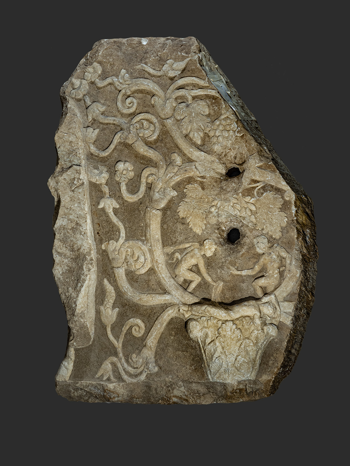 Στην άλλη ανάγλυφη πλευρά διακρίνεται στα αριστερά μια σπασμένη σήμερα ανάγλυφη μορφή ενός Πάνα, από τον οποίο όμως διακρίνονται το πίσω τμήμα του σώματος καλυμμένο από βαρύ ιμάτιο και ο τριχωτός μηρός του ενός ποδιού του και το διχαλωτό άκρο πόδι του. Το σπάσιμο φαίνεται να οφείλεται πιθανόν στο γεγονός ότι με την αλλαγή από την παγανιστική στη χριστιανική θρησκεία, η μορφή του θεωρήθηκε δαιμονική. Κι εδώ απεικονίζεται πάλι μια κληματίδα σχεδιασμένη αριστουργηματικά, που καταλαμβάνει τη συνολική επιφάνεια, η οποία φαίνεται να ξεκινά από ένα φυλλώδες «κιονόκρανο» στο κάτω μέρος του αναγλύφου, αφήνοντας χώρο για τη διηγηματική σκηνή που διαδραματίζεται στο κέντρο της.