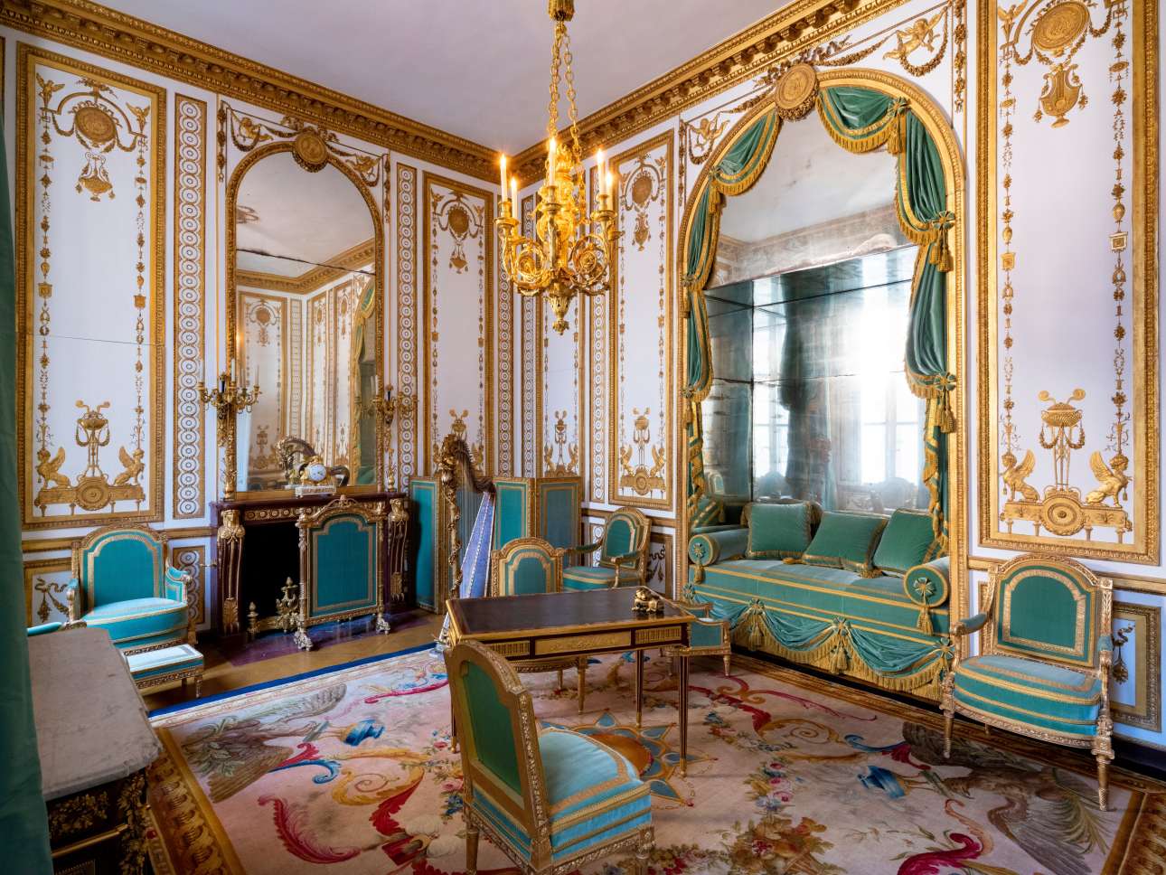 Δίπλα στο μπουντουάρ βρίσκεται η βιβλιοθήκη που στέγαζε την τεράστια συλλογή βιβλίων της πριν μεταφερθούν στο Παρίσι, μετά την Επανάσταση του 1789. Και στο πλάι βρίσκεται η «Χρυσή Αίθουσα» («Le Cabinet Doré»), η οποία δημιουργήθηκε το 1735 για τη βασίλισσα Μαρία Λεστσίνκα, πολωνή σύζυγο του Λουδοβίκου ΙΕ’, και τροποποιήθηκε αρκετές φορές από τη Μαρία Αντουανέτα.