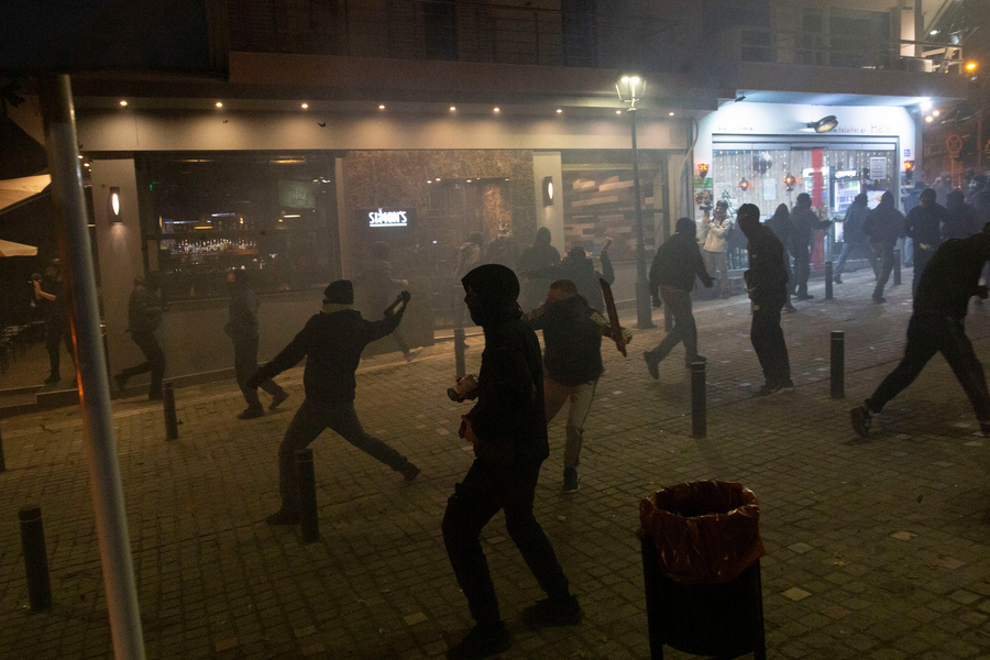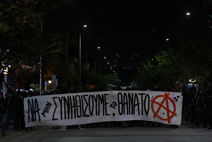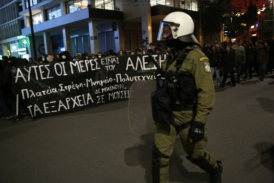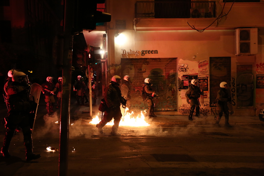 Περίπου 1.000 άτομα που αποσπάστηκαν από την πορεία στο κέντρο της πρωτεύουσας, η οποία διαλύθηκε στην Ομόνοια, έστριψαν στη οδό Εμμανουήλ Μπενάκη όπου άναψαν φωτιές και κατευθύνθηκαν στα Εξάρχεια όπου πέταξαν βόμβες μολότωφ εναντίον αστυνομικών δυνάμεων.
