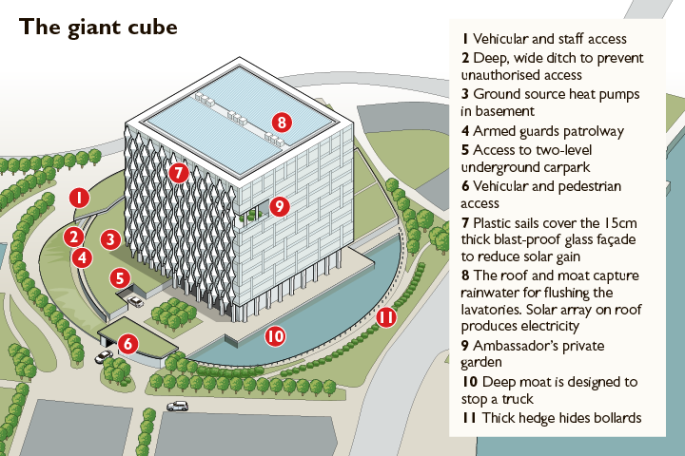 Μ’ αυτά και μ’ αυτά το κόστος θα φτάσει το ένα δισεκατομμύριο δολάρια. Κόστος που καθιστά την 12οροφη πρεσβεία την πιο ακριβή που έχει κατασκευαστεί ποτέ και μάλλον από τις λίγες που θα διαθέτουν τριπλά αλεξίσφαιρα τζάμια, πτυσσόμενα μπαλκόνια, αναδυόμενα τείχη προστασίας και ειδικούς κλωβούς που εμποδίζουν τις ηλεκτρονικές παρακολουθήσεις. Θα υπάρχουν ακόμη στρατώνες για τη φιλοξενία των αμερικανών πεζοναυτών, ιατρικές υποδομές αλλά και μπαρ και γυμναστήριο.