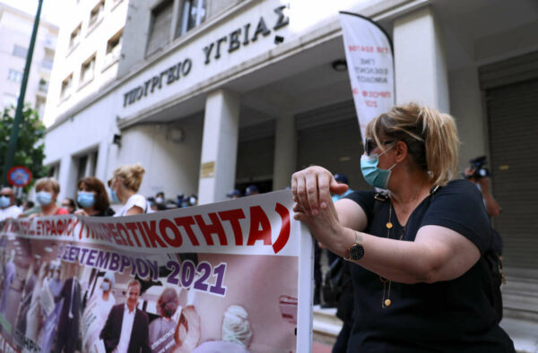 Σε εξέλιξη είναι η συγκέντρωση υγειονομικών, κατόπιν σχετικού καλέσματος της ΠΟΕΔΗΝ, έξω από το υπουργείο Υγείας, κατά της υποχρεωτικότητας των εμβολιασμών και του μέτρου της αναστολής των συμβάσεων εργασίας όσων εξακολουθούν να αρνούνται να εμβολιαστού κατά της Covid-19.