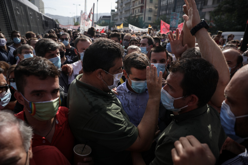 Χάρη στην παρέμβαση της συνοδείας του, ο Αλέξης Τσίπρας απομακρύνθηκε από το σημείο, με εμφανή τα ίχνη της επίθεσης στο πουκάμισό του.