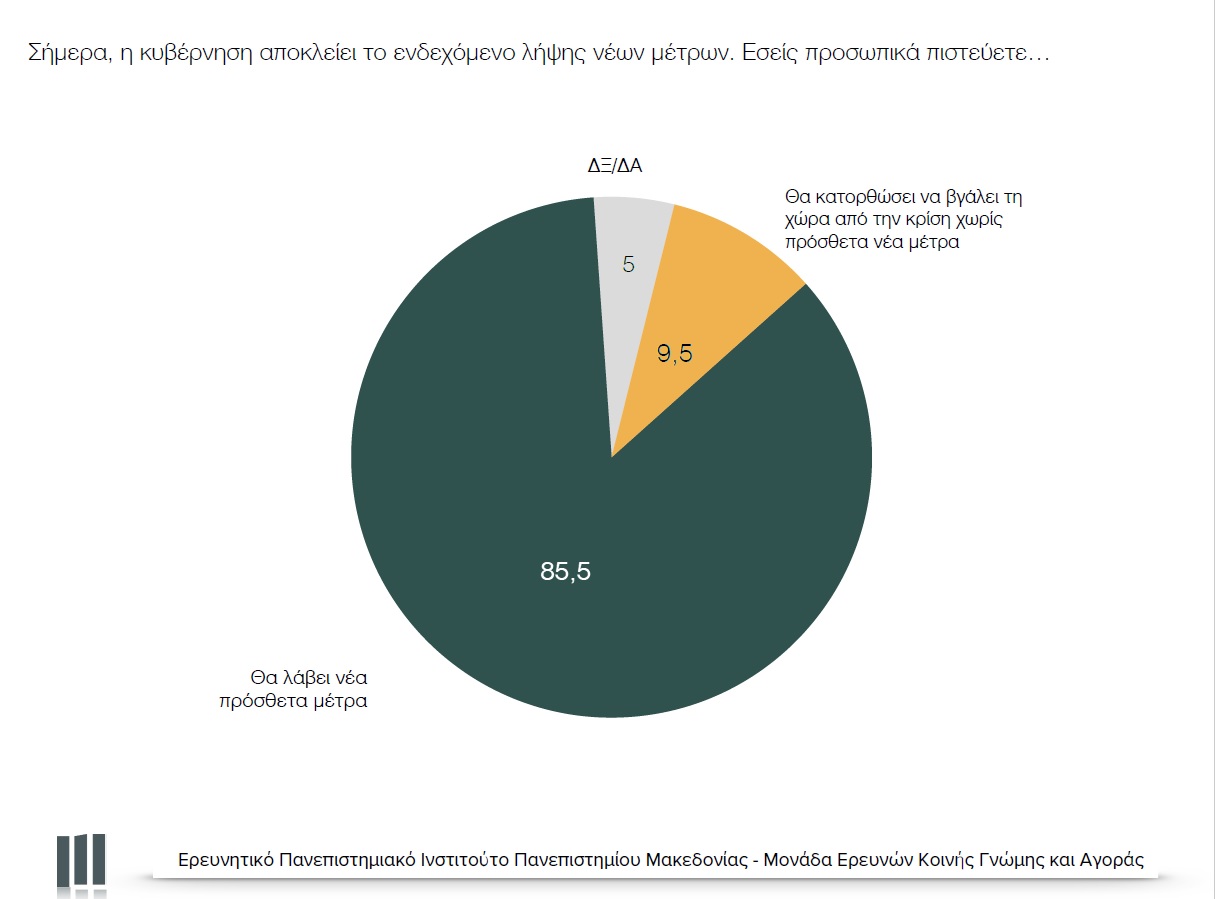 Η μεγάλη πλειοψηφία της κοινής γνώμης (85,5%) εκτιμά ότι η κυβέρνηση θα λάβει και νέα μέτρα και ότι τα πράγματα κινούνται προς τη λάθος κατεύθυνση (80%), ενώ θεωρεί ότι η κυβέρνηση δεν δημιουργεί ευνοϊκό περιβάλλον για τις επενδύσεις στη χώρα (75%). Το 58,5% των ερωτώμενων δηλώνει ότι δεν είναι ικανοποιημένο από το έργο της κυβέρνησης, ενώ για το ναυάγιο στο Σαρωνικό κόλπο και τη ρύπανση που προκάλεσε το 53,5% θεωρεί ότι ο υπουργός Ναυτιλίας Παναγιώτης Κουρουμπλής φέρει πολιτική ευθύνη.