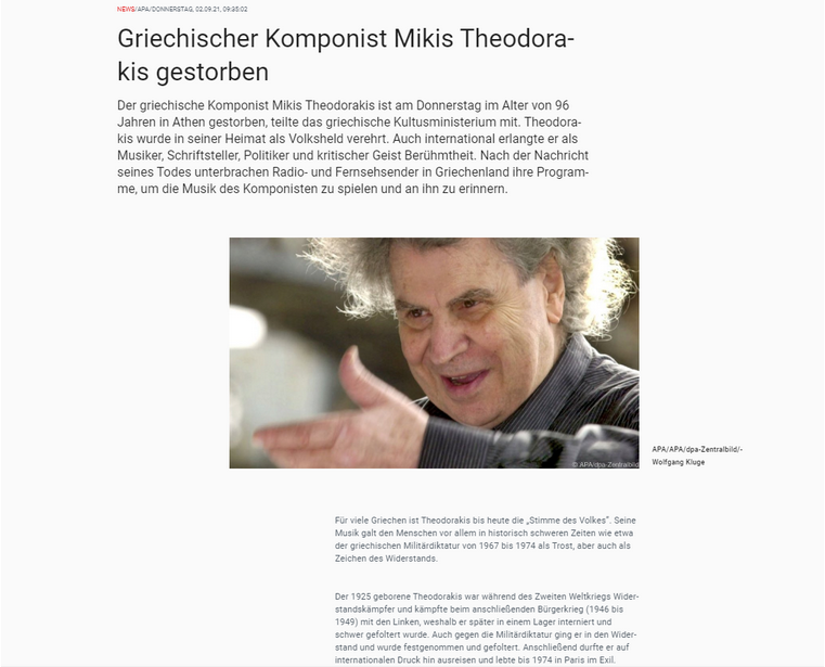 «Στην πατρίδα του, τον Μίκη Θεοδωράκη τιμούσαν ως εθνικό ήρωα, μετά την είδηση του θανάτου του, ραδιοφωνικοί και τηλεοπτικοί σταθμοί στην Ελλάδα διέκοψαν τα προγράμματά τους για να παίξουν τη μουσική του συνθέτη και να τον τιμήσουν», υπογραμμίζεται στο πρωτοσέλιδο τηλεγράφημα του Αυστριακού Πρακτορείου Ειδήσεων, το οποίο αναπαράγεται ήδη από μία σειρά αυστριακών Μέσων Ενημέρωσης στις ιστοσελίδες τους.