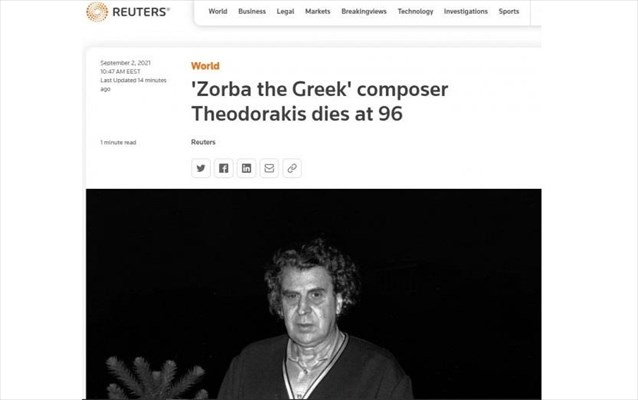 Με τίτλο «ο έλληνας συνθέτης του Ζορμπά πέθανε σε ηλικία 96 ετών», το πρακτορείο ειδήσεων Reuters αναφέρεται συνοπτικά στη ζωή του Μίκη Θεοδωράκη.