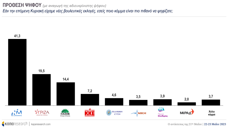 Την πρώτη εκτίμηση για τη νέα εκλογική αναμέτρηση, η οποία φέρεται να έχει «κλειδώσει» για τις 25 Ιουνίου, καταγράφει δημοσκόπηση της Κάπα Research, η πρώτη που βλέπει το φως της δημοσιότητας μετά τις εκλογές της 21ης Μαΐου. Σύμφωνα με την ταυτότητα της έρευνας, το γκάλοπ διενεργήθηκε σε πανελλαδική κλίμακα, το διάστημα 22-23 Μαΐου 2023, σε δείγμα 1002 ατόμων ηλικίας 17 ετών και άνω.