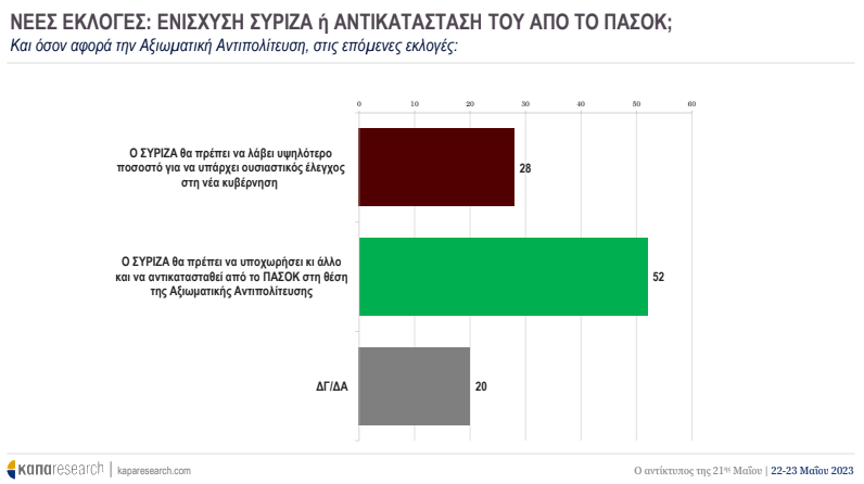 Στα ενδιαφέροντα ευρήματα του γκάλοπ συγκαταλέγεται και το πολύ υψηλό ποσοστό (52%) εκείνων που επιθυμούν την περαιτέρω υποχώρηση της δύναμης του ΣΥΡΙΖΑ στην επόμενη Βουλή και την αντικατάστασή του από το ΠΑΣΟΚ-ΚΙΝΑΛ στη θέση της αξιωματικής αντιπολίτευσης. Στον αντίποδα, μόλις το 28% θέλει εκλογική ενίσχυση του κόμματος του κ. Τσίπρα στις επερχόμενες εκλογές.