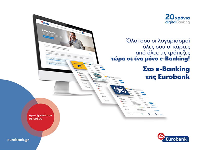 - Μέσω e-Banking και της υπηρεσίας Account Aggregation, οι πελάτες της Eurobank μπορούν να έχουν στην οθόνη του υπολογιστή τους, μέσω ασφαλούς διασύνδεσης, τη συνολική εικόνα των υπολοίπων και τις κινήσεις, σε καταθετικούς λογαριασμούς ή/και πιστωτικές κάρτες που διατηρούν σε οποιαδήποτε ελληνική συστημική τράπεζα!