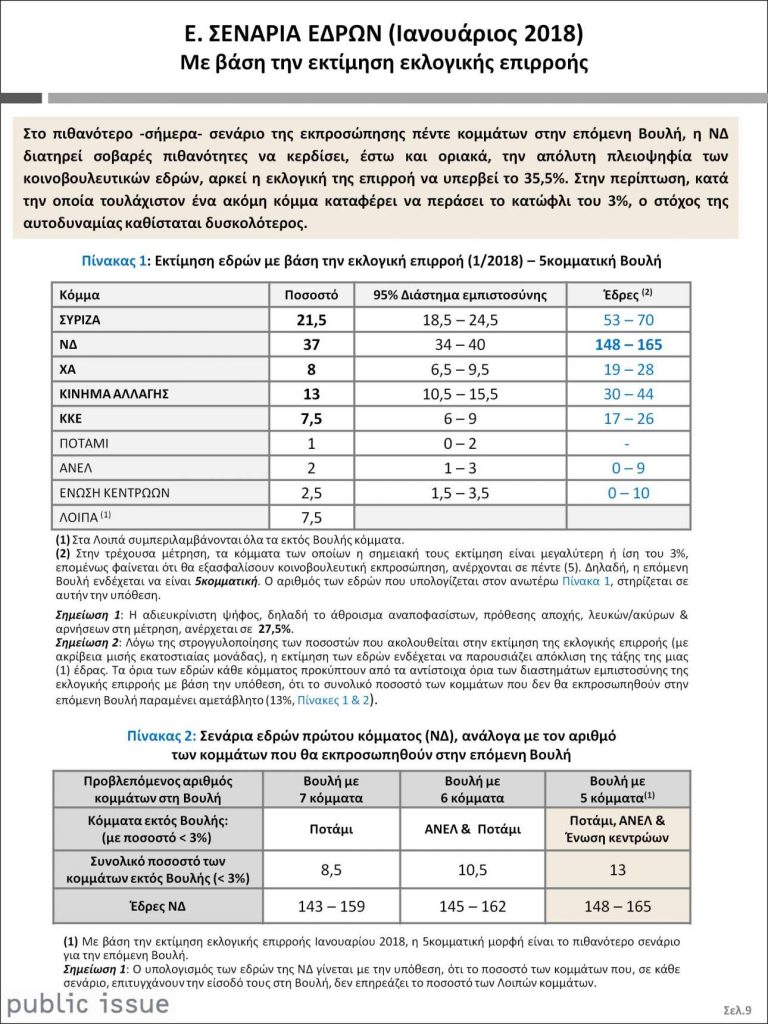 Σύμφωνα με την ανάλυση της Public Issue, την είσοδό τους στη Βουλή εξασφαλίζουν, κατά πάσα πιθανότητα, μόνο πέντε κόμματα: η ΝΔ, ο ΣΥΡΙΖΑ, το Κίνημα Αλλαγής, η Χρυσή Αυγή και το ΚΚΕ, ενώ σημαντικές πιθανότητες διατηρούν η Ένωση Κεντρώων και οι Ανεξάρτητοι Έλληνες (η εκτίμηση εκλογικής επιρροής της Ένωσης Κεντρώων απέχει μόλις 0,5%, ενώ των ΑΝΕΛ απέχει 1% από το όριο κοινοβουλευτικής εκπροσώπησης του 3%).