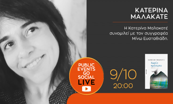 Την Παρασκευή 9/10 και ώρα 20.00 η Κατερίνα Μαλακατέ, συνομιλεί με τον συγγραφέα Μίνω Ευσταθιάδη για το νέο της βιβλίο «Χωρίς πρόσωπο».