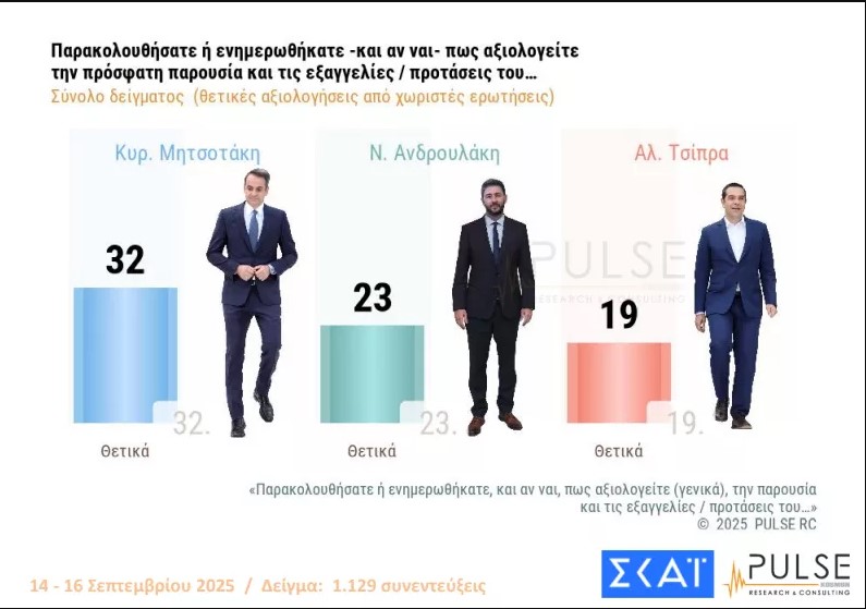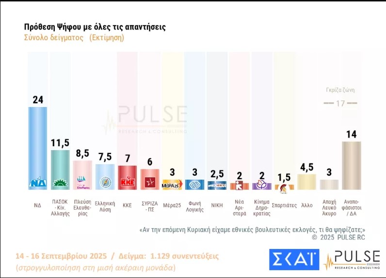 Στο 29% διαμορφώνεται το ποσοστό της Νέας Δημοκρατίας, έναντι 14% του ΠΑΣΟΚ, στην εκτίμηση αποτελέσματος, σύμφωνα με τη νέα δημοσκόπηση της Pulse, τα στοιχεία της οποίας δημοσιοποιήθηκαν το βράδυ της Τετάρτης (17.09) για λογαριασμό του τηλεοπτικού σταθμού ΣΚΑΪ.