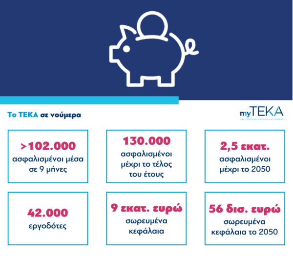 Το myTEKA είναι μια ηλεκτρονική πλατφόρμα που παρέχει πλήρη ενημέρωση για τις εισφορές και την εξέλιξη της αποταμίευσής τους. Οι ασφαλισμένοι σταδιακά θα βλέπουν πού πραγματικά συγκεντρώνονται και επενδύονται οι εισφορές τους.