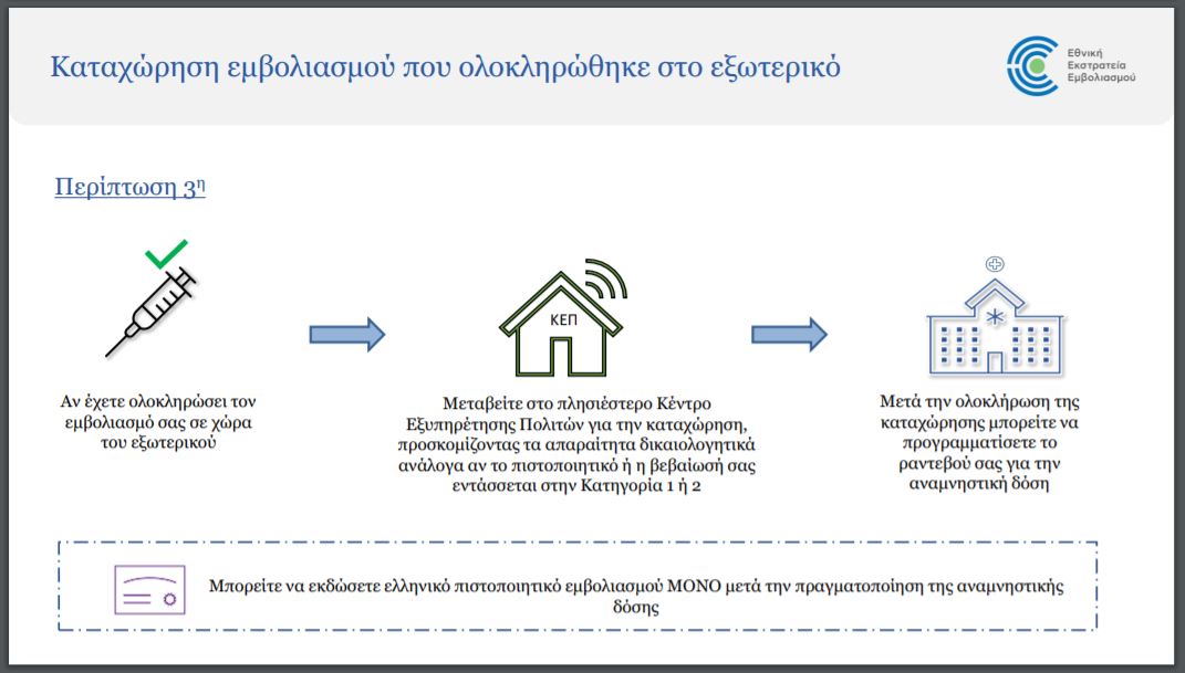 Σύμφωνα με την ΚΥΑ, «Ελληνες πολίτες, πολίτες κράτους–μέλους της Ευρωπαϊκή Ενωσης (ΕΕ) ή υπήκοοι τρίτων χωρών, οι οποίοι έχουν πραγματοποιήσει τις δύο δόσεις εμβολιασμού για την λοίμωξη Covid-19 ή εφόσον πρόκειται για μονοδοσικό εμβόλιο, τη μοναδική δόση, σε οποιοδήποτε άλλο κράτος πλην της Ελλάδας, δύνανται να προσέρχονται στα ΚΕΠ για να υποβάλουν αίτηση προγραμματισμού της αναμνηστικής δόσης εμβολιασμού σε εμβολιαστικό κέντρο της χώρας, αφού προηγουμένως καταχωριστούν στα Μητρώα Εμβολιασμένων Εξωτερικού κατά του κορονοϊού».