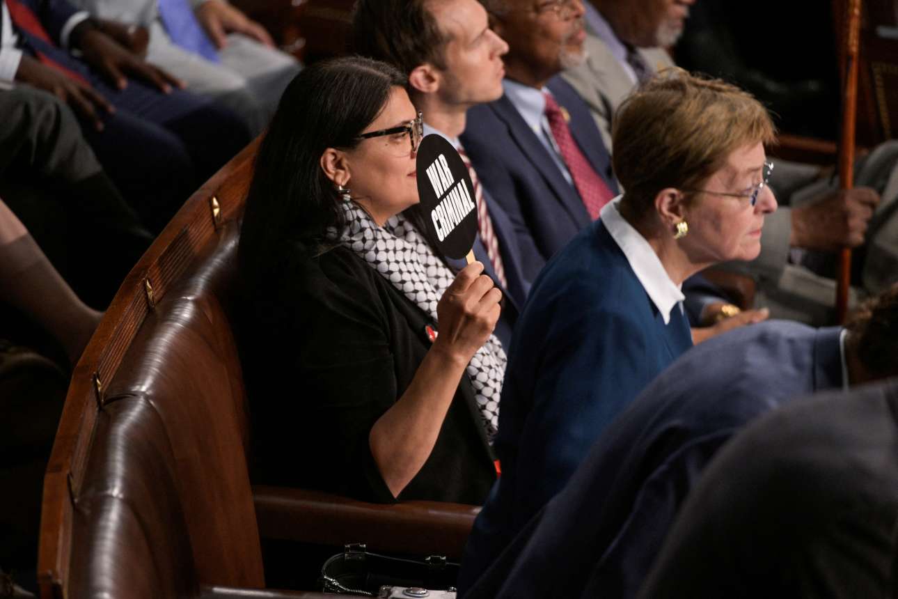 Η Ρασίντα Ταλίμπ, η μόνη βουλευτής παλαιστινιακής καταγωγής, προτίμησε να παραστεί στην ομιλία, αλλά κρατούσε ένα μικρό πλακάτ με τις φράσεις «εγκληματία πολέμου» και «ένοχος για διάπραξη γενοκτονίας».