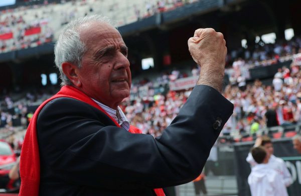 Ο πρόεδρος της Ρίβερ Πλέιτ Ροδόλφο ντ΄ Ονόφριο σε χειρονομία πυγμής προς τους οπαδούς, πριν από τον αγώνα. Στο τέλος φυγαδεύθηκε κι αυτός… (φωτό: REUTERS/ Marcos Brindicci)