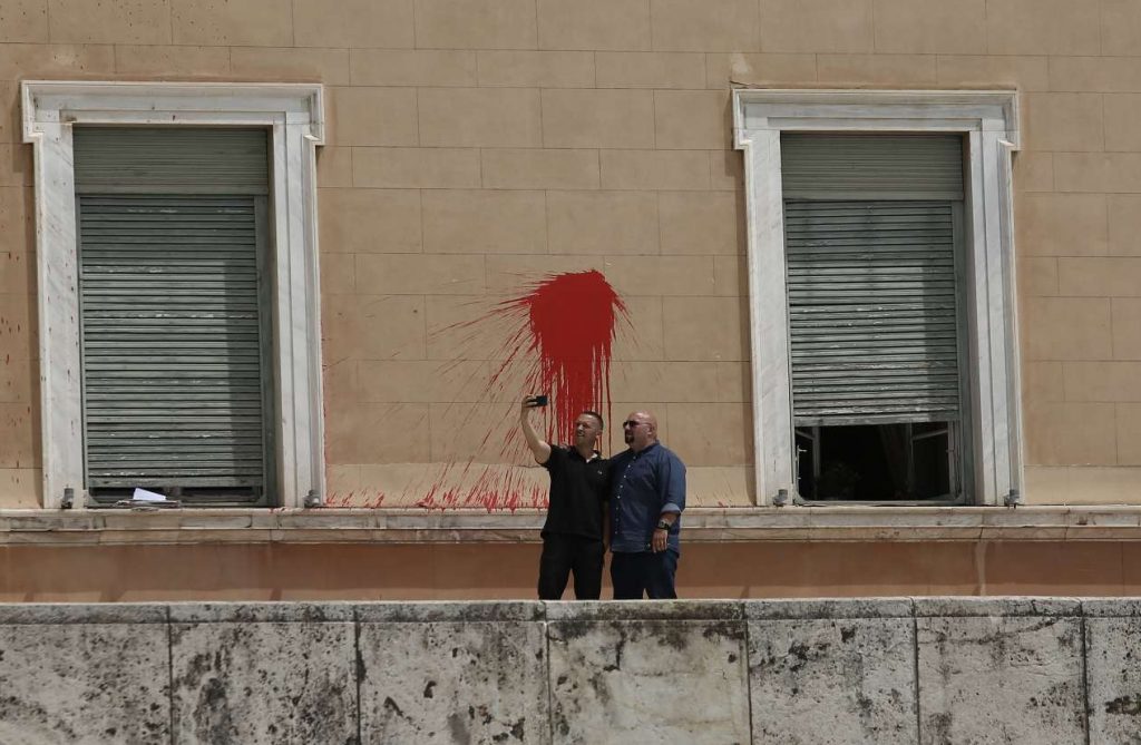 Ηλιας Κασιδιάρης και Ηλίας Παναγιώταρος απαθανατίστηκαν να πανηγυρίζουν για τη θλιβερή κατάντια του κοινοβουλίου, βγάζοντας σέλφι με φόντο τις κόκκινες μπογιές στους τοίχους του «Ναού της Δημοκρατίας» (φωτογραφία κάτω).
