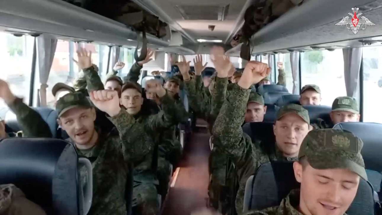 Ρώσοι στρατιώτες μετά την απελευθέρωσή τους μεταφέρονται στη Λευκορωσία/ Russian Defence Ministry/Handout via REUTERS ATTENTION EDITORS
