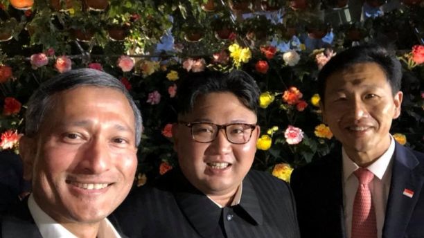 Στην (προφανώς προσχεδιασμένη) βόλτα του στη μαρίνα της Σιγκαπούρης, ο Κιμ Γιονγκ Ουν υπέκυψε και αυτός στις σέλφι, ίσως την πρώτη του, με τον υπουργό Εξωτερικών της Σιγκαπούρης Βιβιάν Μπαλακρισνάν (αριστερά) και τον υπουργό Παιδείας Ονγκ Γε Κουνγκ