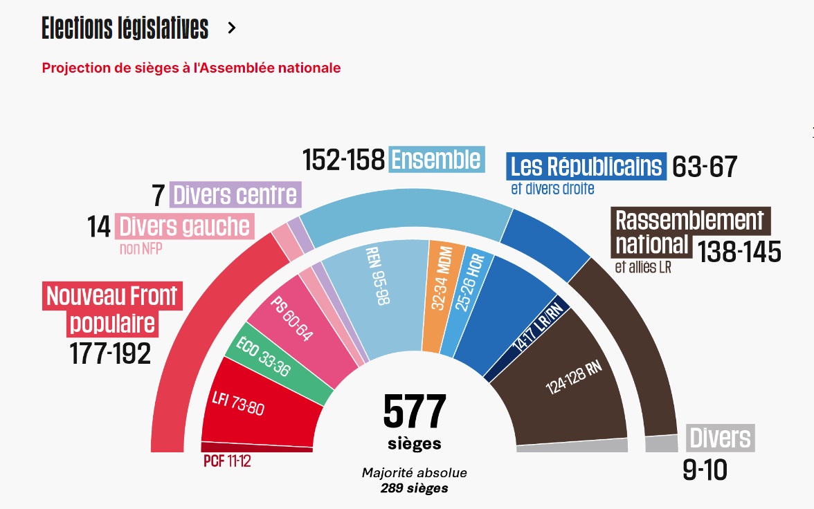 Σύμφωνα με τα επίσημα αποτελέσματα που ανακοινώθηκαν νωρίς τη Δευτέρα, ο αριστερός συνασπισμός του Νέου Λαϊκού Μετώπου λαμβάνει 182 έδρες, μπροστά από την κεντρώα συμμαχία του προέδρου Μακρόν, που δείχνει να συγκεντρώνει 168 έδρες.