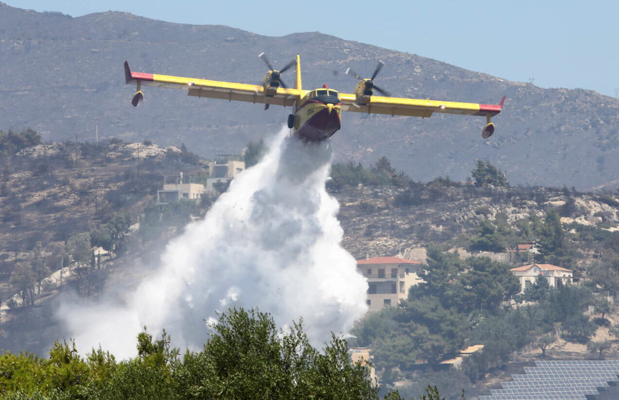 Οι ρίψεις από αεροσκάφη Καναντέρ στην περιοχή της Διώνης ήταν συνεχείς προκειμένου να σωθούν από τις φλόγες όσο περισσότερα σπίτια γίνεται.