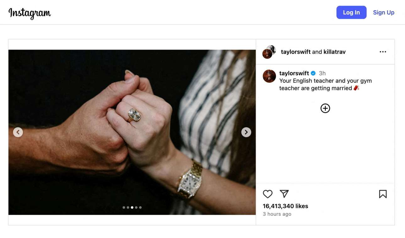 Στην τελευταία φωτογραφία του καρουζέλ της ανάρτησης, η Σουίφτ, φορώντας ένα φόρεμα Ralph Lauren κομμένο στον λαιμό και ένα ρολόι Cartier με διαμάντια, δείχνει το χρυσό δαχτυλίδι αρραβώνων της με κομμένο διαμάντι. Το BBC αναφέρει ότι σύμφωνα με αμερικανικά δημοσιεύματα, το κόσμημα αγοράστηκε από το κοσμηματοπωλείο Artifex Fine Jewelry, οι τιμές των δαχτυλιδιών του οποίου ξεκινούν από 29.000 δολάρια (25.000 ευρώ).