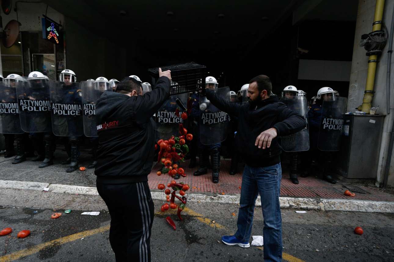 Δεν χρειάστηκε πολύ ώρα για να ανάψει η φωτιά ανάμεσα στους συγκεντρωμένους αγρότες και τους άνδρες των ΜΑΤ. Οι αγρότες πέταξαν καπνογόνα, ντομάτες και πέτρες προς το κτίριο και τους αστυνομικούς, οι οποίοι απάντησαν με χημικά.