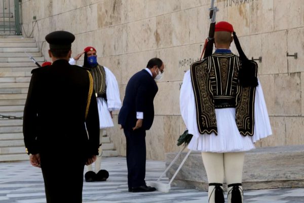 O πρόεδρος της Αιγύπτου κατέθεσε πρώτα στεφάνι στο Μνημείο του Αγνώστου Στρατιώτη, πριν μεταβεί στο Προεδρικό Μέγαρο, όπου τον υποδέχθηκε η Πρόεδρος της Ελληνικής Δημοκρατίας.