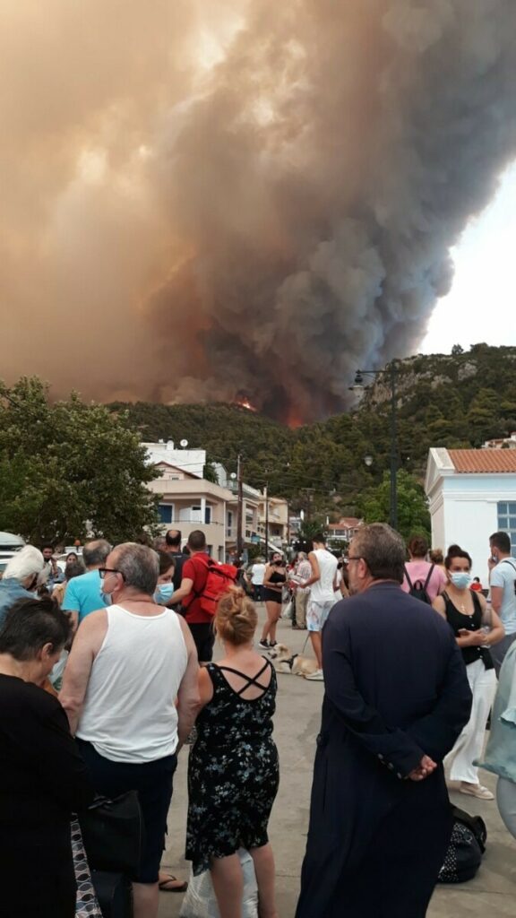 Τα τοπικά Μέσα μετέδωσαν εικόνες των κατοίκων της Λίμνης να αναμένουν κοντά στη θάλασσα με βαλίτσες προκειμένου να αποχωρήσουν από το χωριό ενώ οι καπνοί της φωτιάς προβάλουν απειλητικοί στον λόφο πίσω από τα σπίτια.