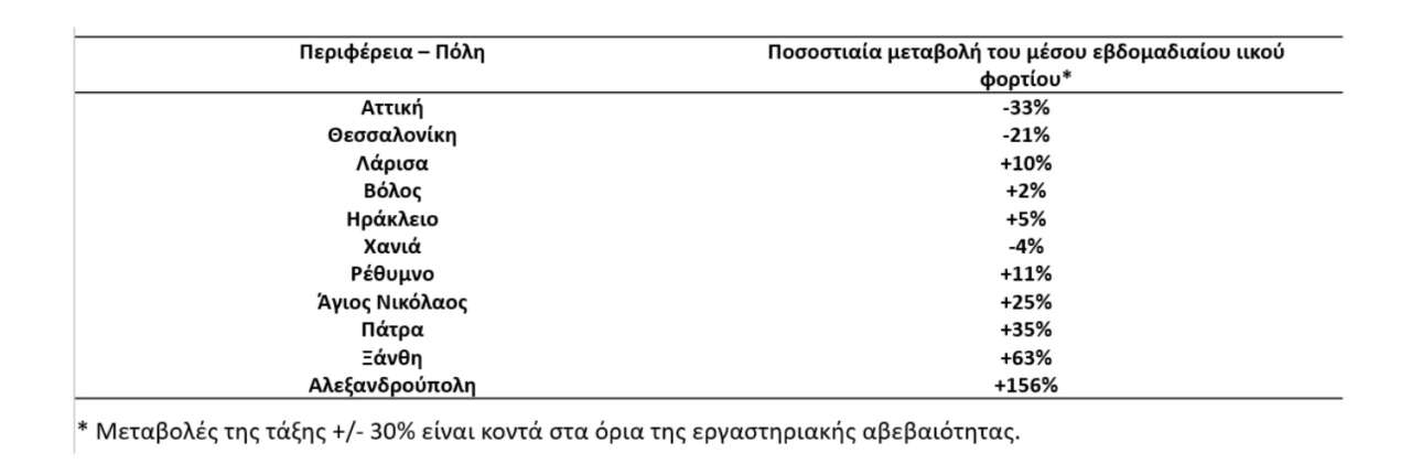 Οι οριακές μεταβολές σημειώνονται στη Θεσσαλονίκη (-21%), στο Ρέθυμνο (+11%) και στον Αγιο Νικόλαο (+25%), ενώ σταθερό παραμένει ουσιαστικά το φορτίο στις πόλεις των Χανίων, του Βόλου, του Ηρακλείου και της Λάρισας, όπου η μεταβολή του ιικού φορτίου στα λύματα κυμαίνεται από -4% έως +10%.