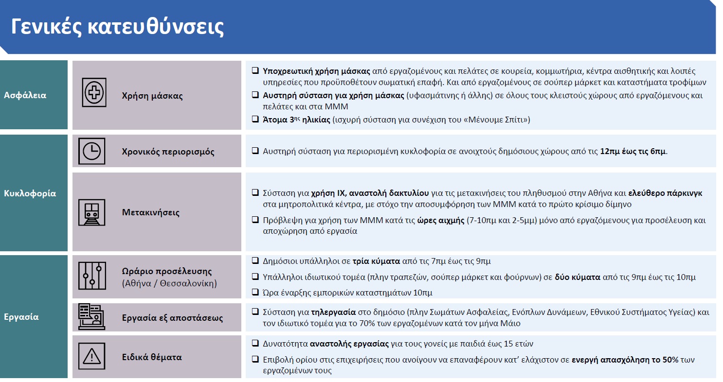 Την ίδια στιγμή ανέφερε ότι υπάρχουν σαφείς κατευθύνσεις για τους νέους κανόνες κοινωνικής αποστασιοποίησης και θα ανακοινωθούν τις επόμενες ημέρες.