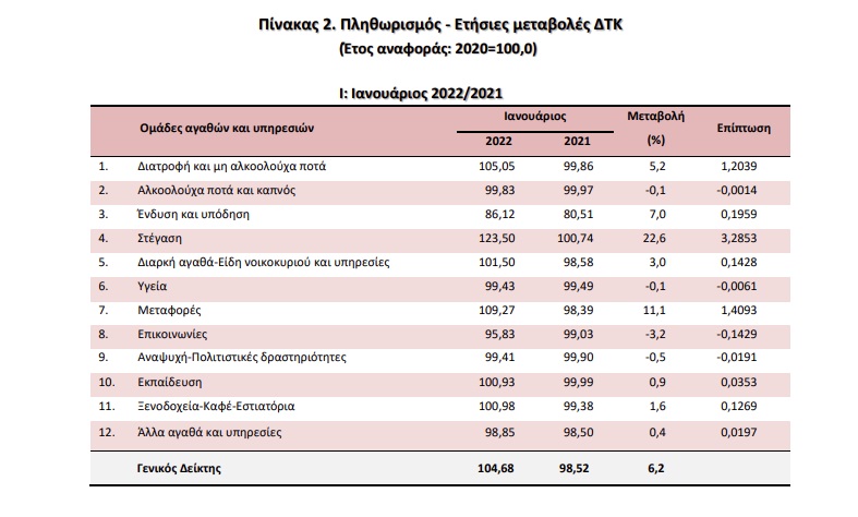 Σε επίπεδα πρωτοφανή για τον 21ο αιώνα ανέβηκε ο πληθωρισμός στην Ελλάδα τον μήνα Ιανουάριο, με βάση τα στοιχεία που δημοσιοποίησε την Τρίτη η Ελληνική Στατιστική Αρχή. Σε σύγκριση με τον Ιανουάριο του 2021, ο Δείκτης Τιμών Καταναλωτή σημείωσε αύξηση 6,2% (έναντι μείωσης 2,0% που σημειώθηκε κατά την αντίστοιχη σύγκριση του έτους 2021 με το 2020). Τον Δεκέμβριο του 2021, ο πληθωρισμός ήταν στο 5,1%.