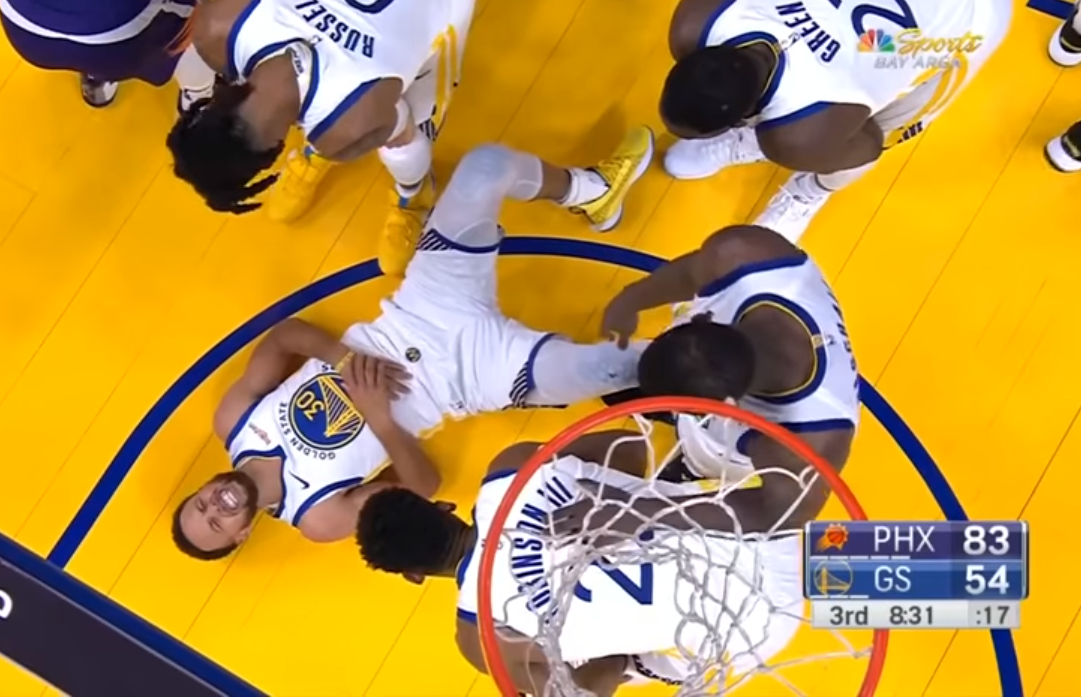 Ολα συνέβησαν στην αρχή της τρίτης περιόδου και ενώ το Γκόλντεν Στέιτ έχανε με 29 πόντους διαφορά. Ο Κάρι σε μια κίνηση απελπισίας και εκνευρισμού προσπάθησε να περάσει όλους τους αντίπαλους παίκτες και να καρφώσει. Ομως τα πράγματα δεν πήγαν όπως τα υπολόγιζε.