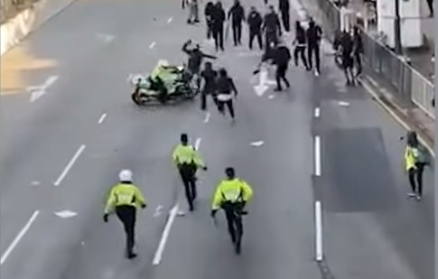 Ο αστυνομικός έχει πιάσει από το λαιμό σε κεφαλοκλείδωμα έναν διαδηλωτή. Ενας άλλος διαδηλωτής με μάσκα πλησιάζει και τότε ο αστυνομικός τραβά το όπλο του και πυροβολεί από πολύ μικρή απόσταση τον δεύτερο διαδηλωτή, ο οποίος πέφτει κάτω. Ο αστυνομικός πυροβόλησε άλλες δύο φορές χωρίς να τραυματιστεί κανένας.