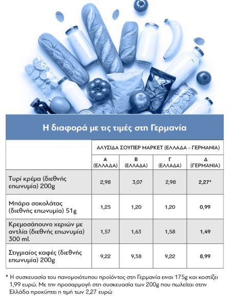 Αυτή ήταν λοιπόν η εικόνα των τιμών την Πέμπτη 11 Σεπτεμβρίου σε τρεις πασίγνωστες αλυσίδες σουπερμάρκετ στην Ελλάδα, στην Α, τη Β και τη Γ *, και σε μια αλυσίδα σουπερμάρκετ της Γεμανίας, τη Δ. Σημειώνεται ότι η σύγκριση αφορά το ίδιο επώνυμο συσκευασμένο προϊόν. (Την ίδια άσκηση μπορεί να κάνει καθημερινά ο καθένας, συγκρίνοντας όμοια προϊόντα στις ιστοσελίδες ενός ελληνικού και ενός γερμανικού σουπερμάρκετ)