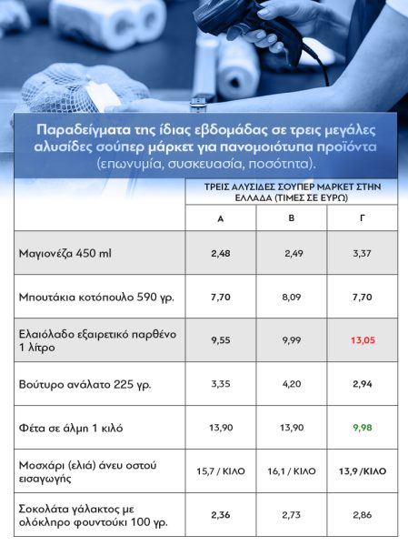 Ο πίνακας, πέρα από το ύψος των τιμών, αποτυπώνει τη δυσκολία να εκμεταλλευθεί κανείς τις εβδομαδιαίες προσφορές σε βασικά είδη διατροφής. Για παράδειγμα, αν κάποιος επιλέξει να αγοράσει 1 κιλό φέτα από την αλυσίδα Γ, που πωλείται 28% φτηνότερα από τα άλλα δύο σουπερμάρκετ (9,98 αντί για 13,90 ευρώ), δεν θα πρέπει να αγοράσει ελαιόλαδο από την ίδια αλυσίδα γιατί είναι 36% ακριβότερο (13,05 αντί για 9,55 ευρώ). Επομένως, αν δεν αγοράσει λάδι από άλλη αλυσίδα σουπερμάρκετ, πράγμα χρονικά αδύνατο για τους περισσότερους, το όφελος από τη φθηνότερη φέτα θα εξανεμιστεί από το ακριβότερο λάδι.