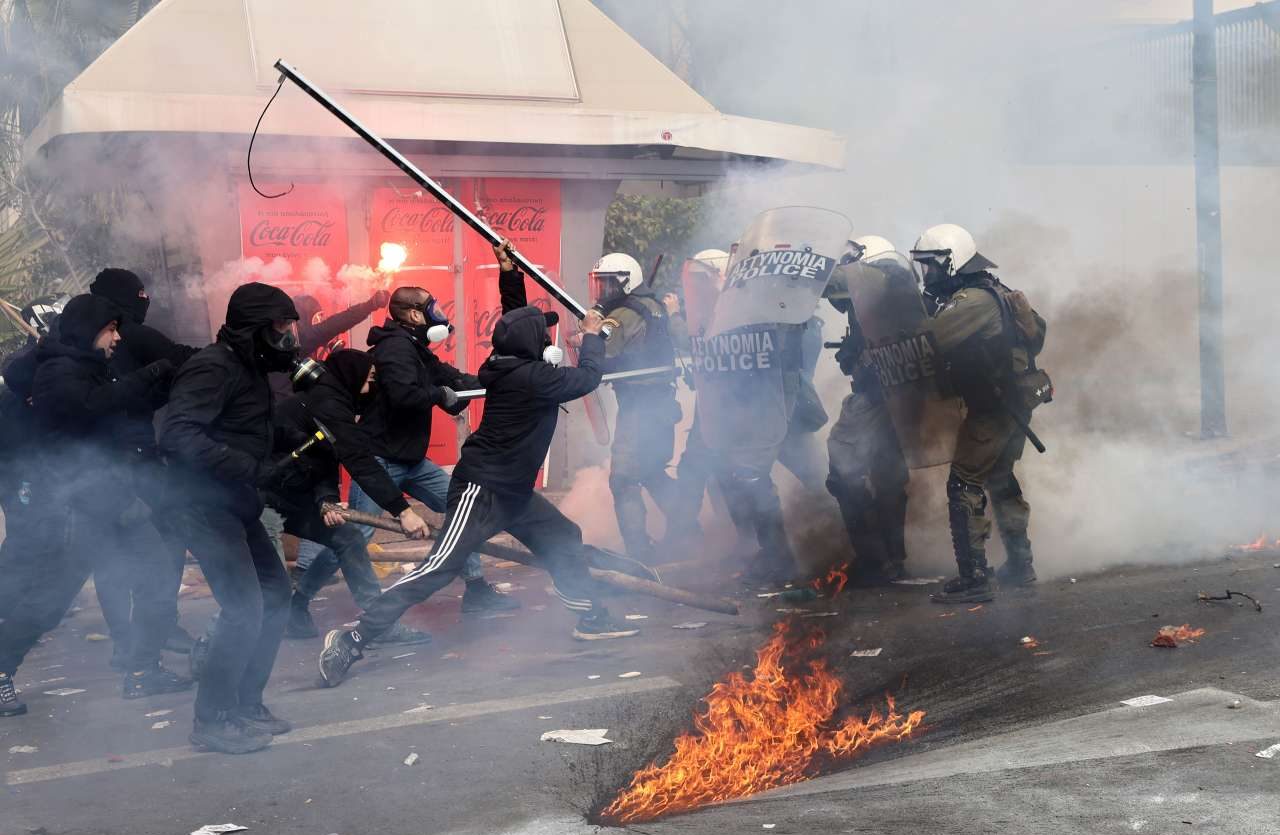 H κάτω πλευρά της πλατείας μετατράπηκε σε πεδίο μάχης μεταξύ των κουκουλοφόρων και ισχυρών δυνάμεων των ΜΑΤ που μέσα σε περίπου είκοσι λεπτά κατάφεραν να τους απομακρύνουν προς Ερμού και Καραγιώργη Σερβίας.