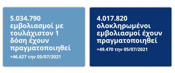 Τη Δευτέρα οι εμβολιασμοί πρώτης δόσης ήταν 5.034.790. Οι ολοκληρωμένοι εμβολιασμένοι ήταν 4.017.820.