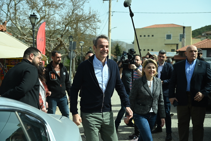 Ο πρωθυπουργός Κυριάκος Μητσοτάκης συνομιλεί με πολίτες κατά τη διάρκεια της επίσκεψής του στα Καλάβρυτα