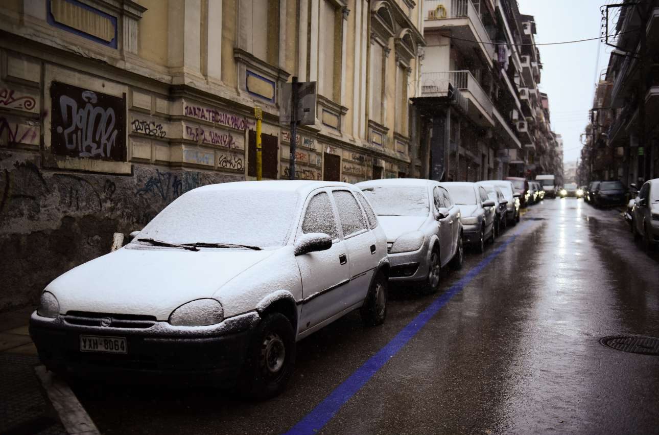 Στη Θεσσαλονίκη, όπου το θερμόμετρο έδειχνε 0 βαθμούς Κελσίου, νιφάδες χιονιού έπεφταν το πρωί ακόμη και στο κέντρο της πόλης.